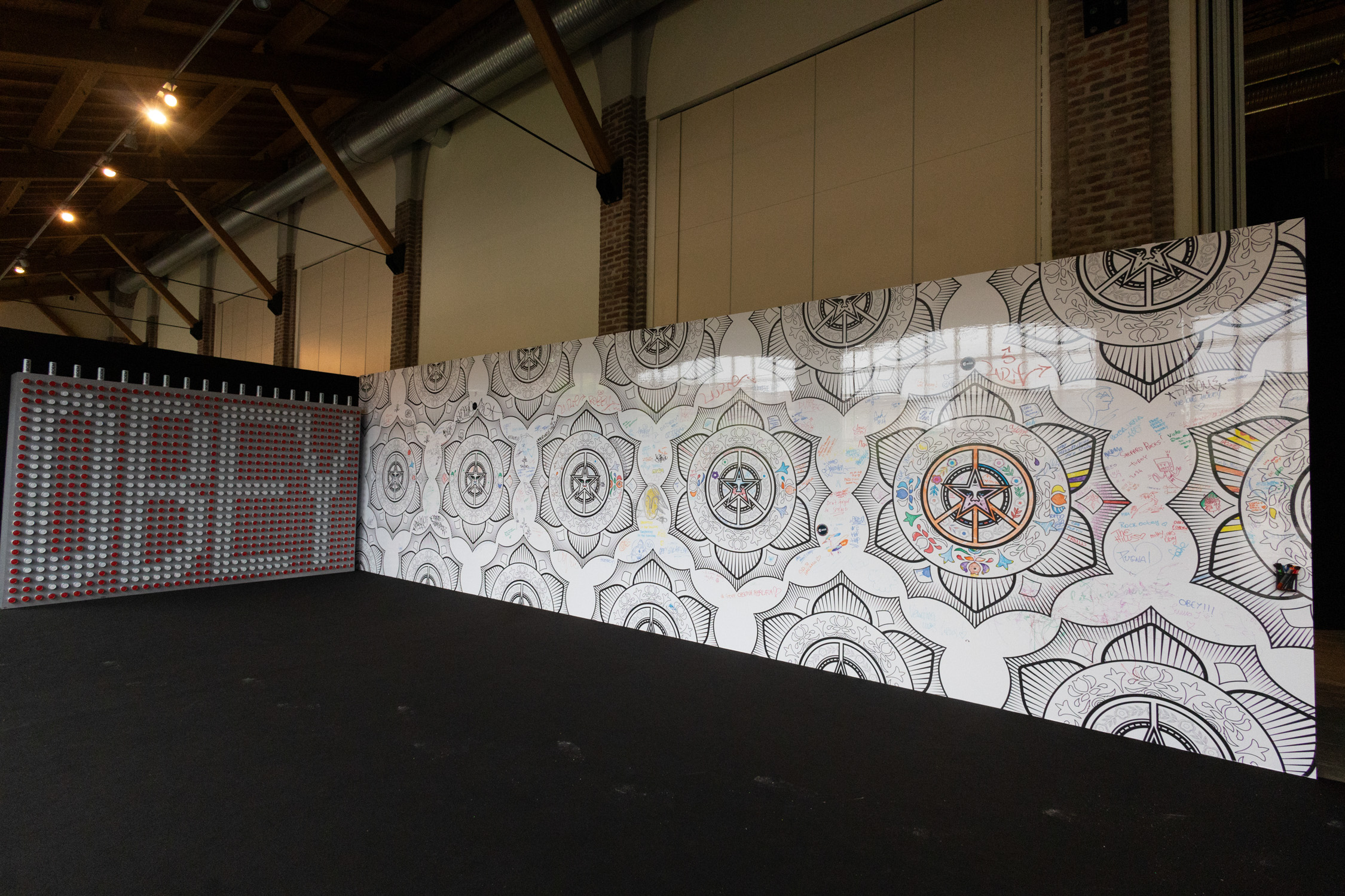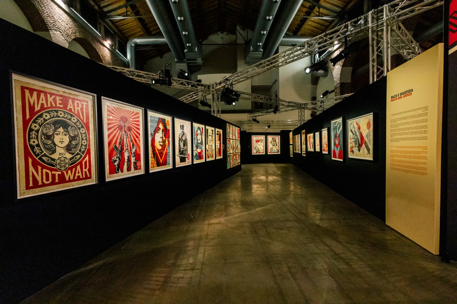 The exhibition opens with works featuring images and iconic, evocative symbols from the renowned OBEY campaign through which the artist elevated Street Art to a powerful expression medium. Continuing through the artworks of the peace and justice section, Shepard Fairey, leveraging the power of images, focuses on themes such as human rights, abuse of power, war and peace. Great attention is given to the latter theme, closely intertwined with the selection of Fabbrica del Vapore as the venue for his first solo exhibition in Italy: a former local transport company manufacturing railway and tramway equipment, during World Wars I and II itrefused to convert its production to war-related products.