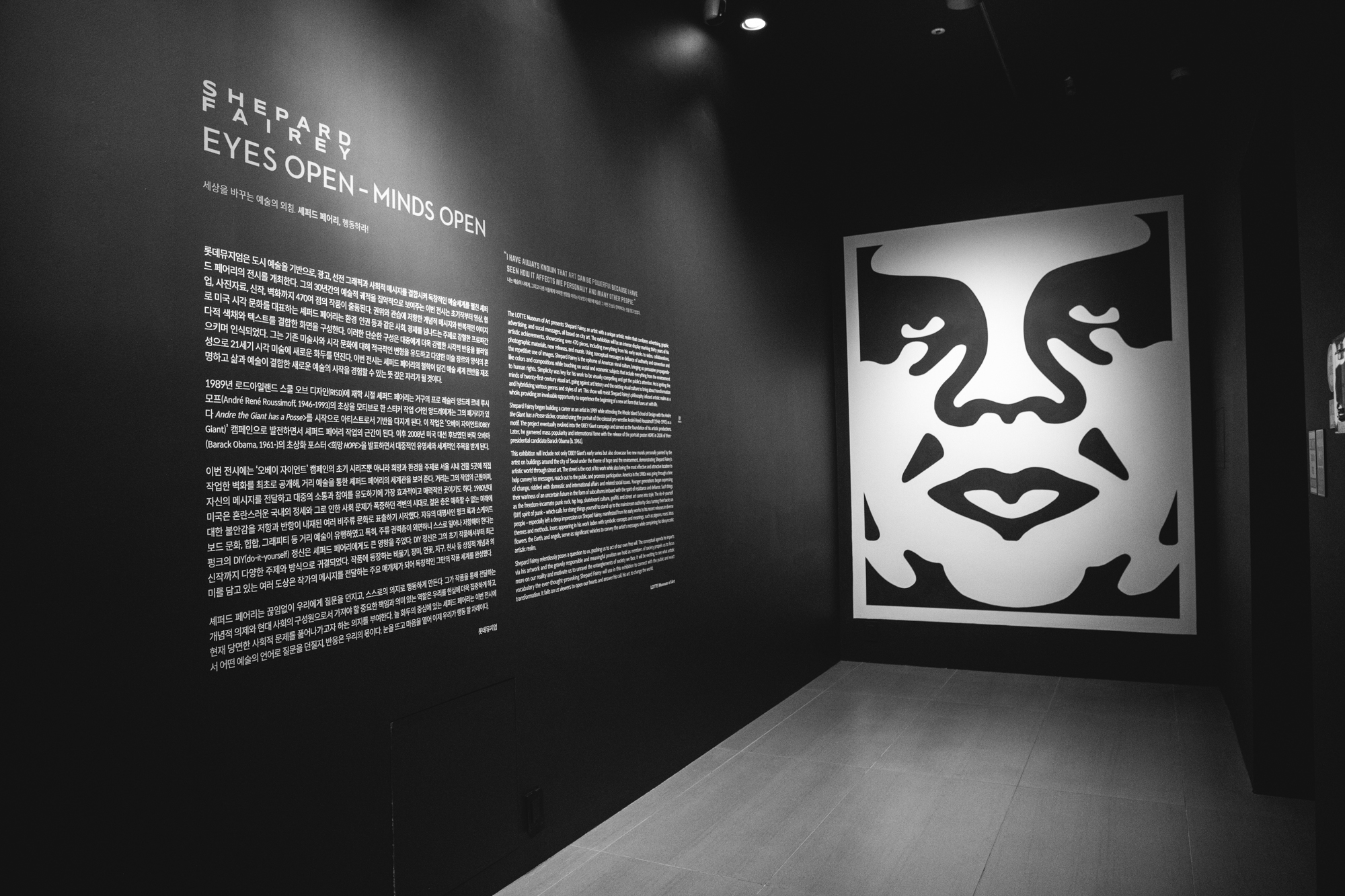 The LOTTE Museum of Art presents Shepard Fairey, an artist with a unique artistic realm that combines advertising, graphic advertising, and social messages, all based on city art. The exhibition will be an intense display marking thirty years of his artistic achievements, showcasing over 470 pieces, including everything from his early works to video, collaborations, photographic materials, new releases, and murals. Using conceptual messages in defiance of authority and convention and the repetitive use of images, Fairey is the epitome of American visual culture, bringing us persuasive propaganda-like colors and compositions while touching on social and economic subjects that include everything from the environment to human rights. Simplicity was key for his work to be visually compelling and get the public’s attention. He is igniting the minds of twenty-first-century visual art, going against art history and the existing visual culture to bring about transformation and hybridizing various genres and styles of art. This show will revisit Fairey’s philosophy-infused artistic realm as a whole, providing an invaluable opportunity to experience the beginning of a new art form that fuses art with life.