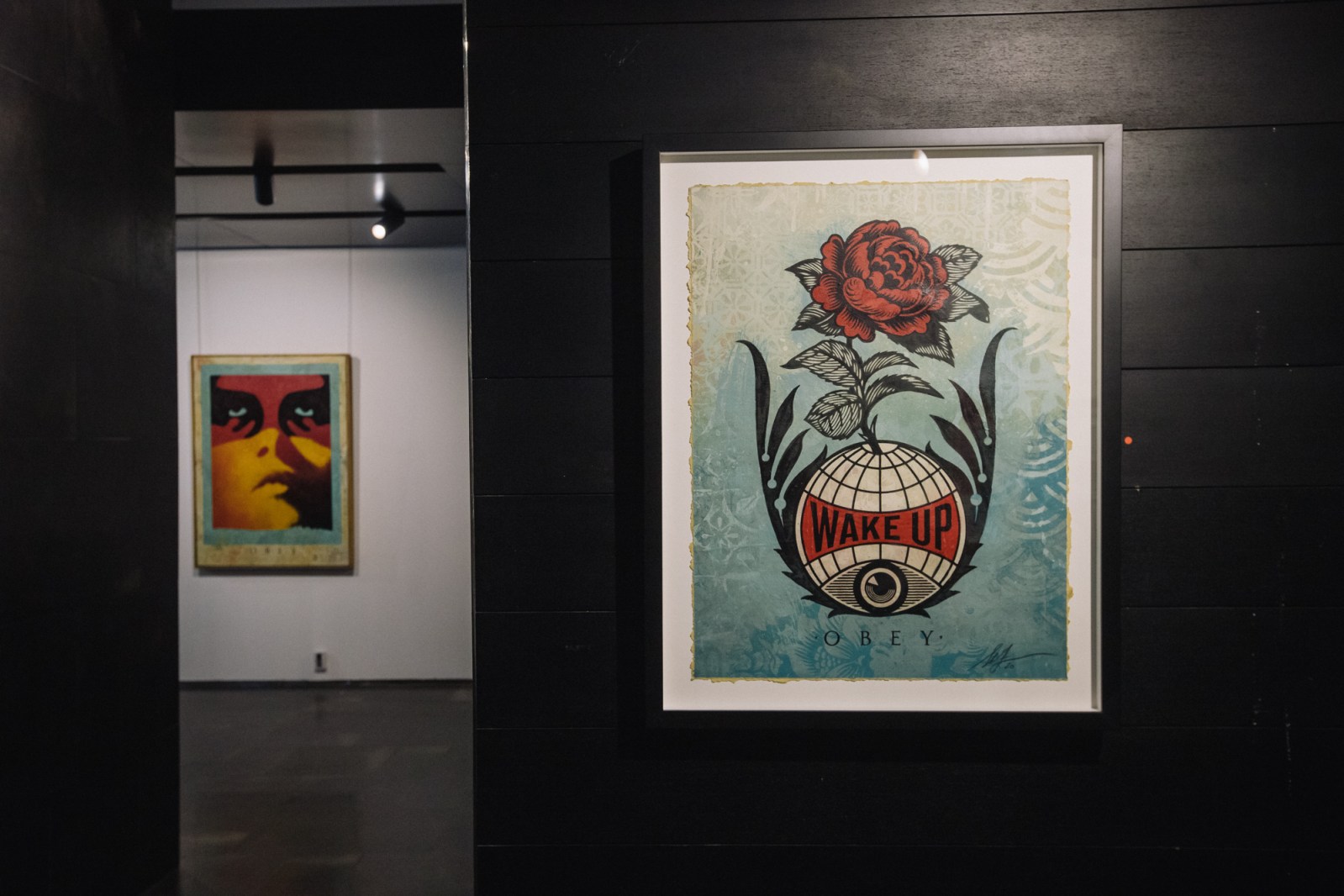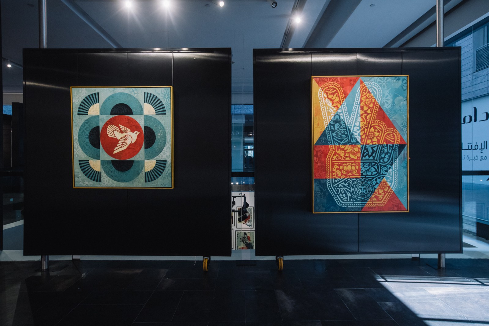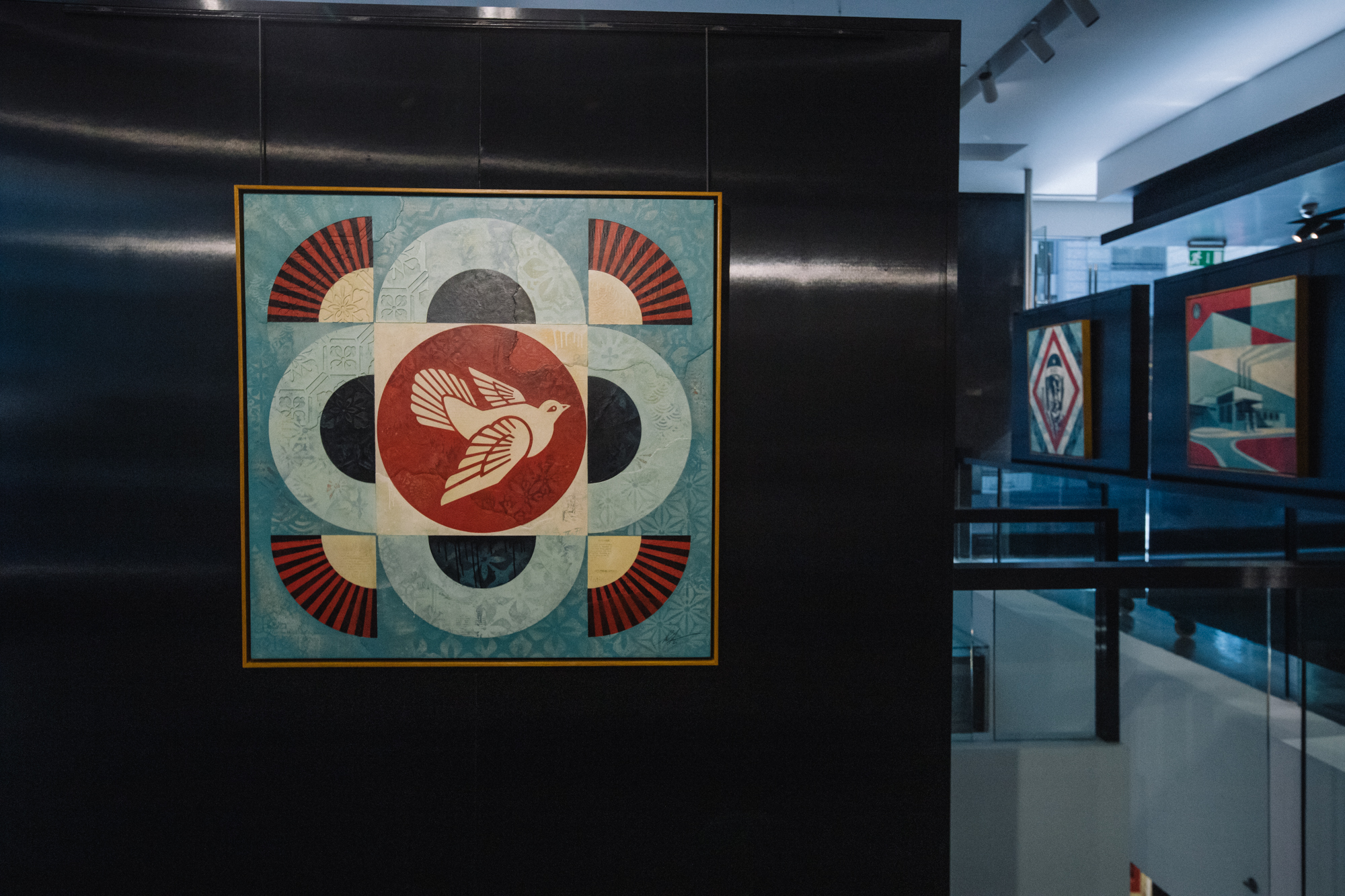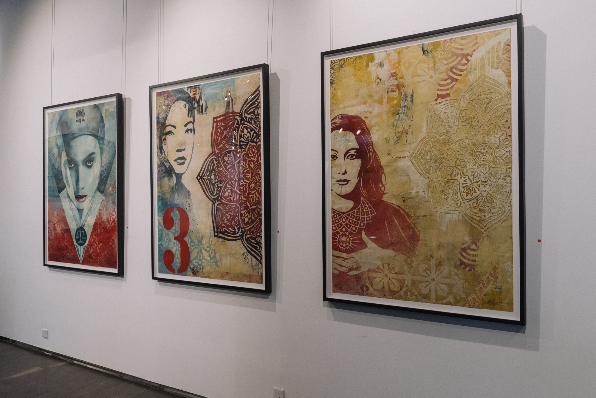The Opera Gallery exhibition in Dubai features a large number of new works that point toward Fairey’s development, but it also includes classic imagery that has been refreshed and reflects on his history of image-making. Fairey’s rich use of pattern along with motifs influenced by a variety of cultures throughout history, including ornamentation and references to Middle Eastern and Arab symbology, come together harmoniously.