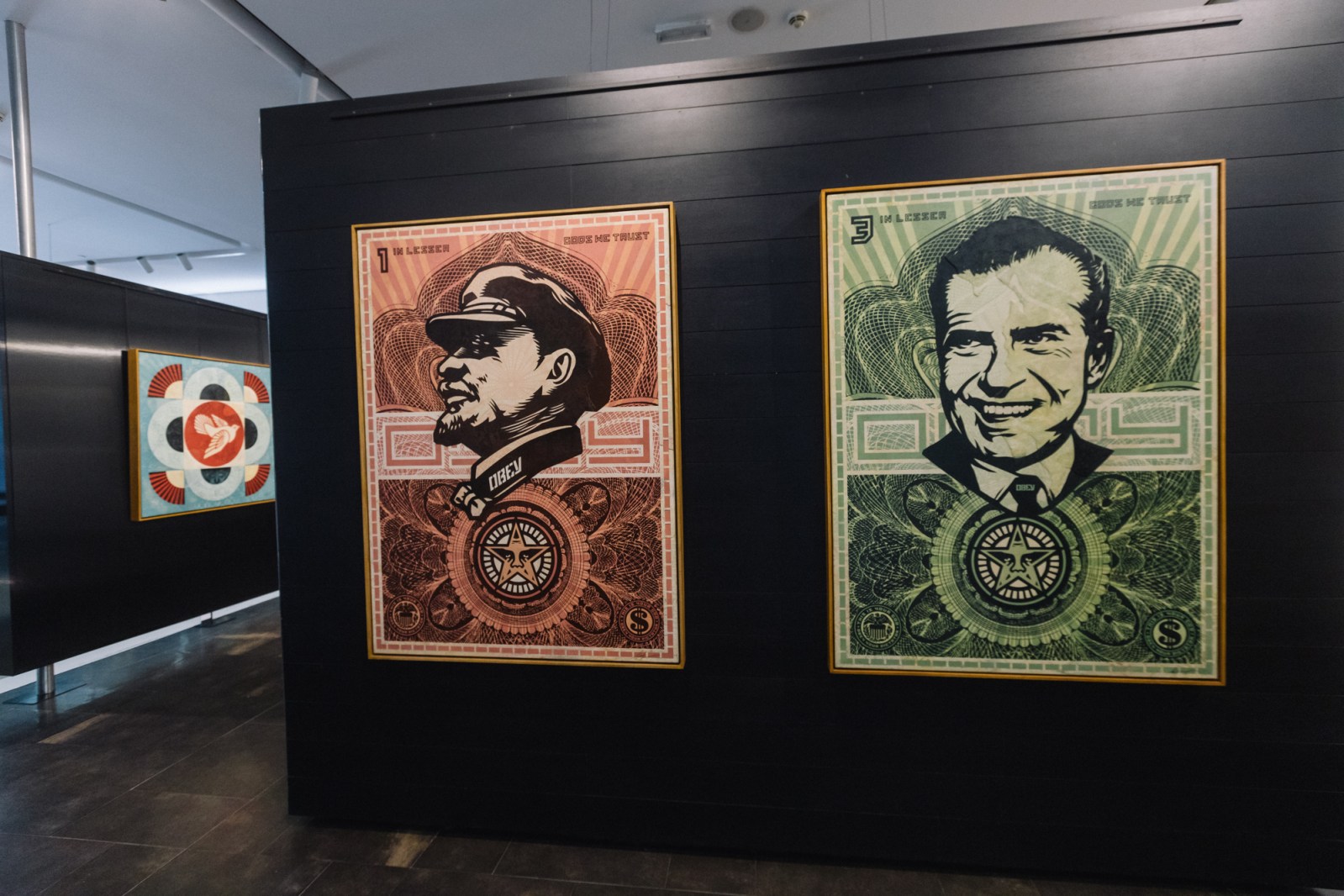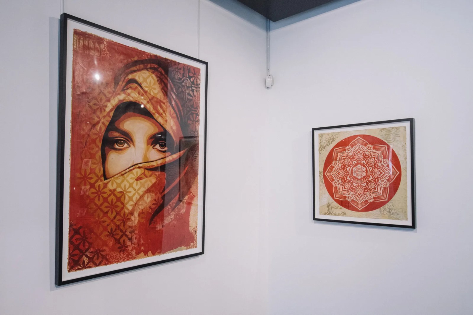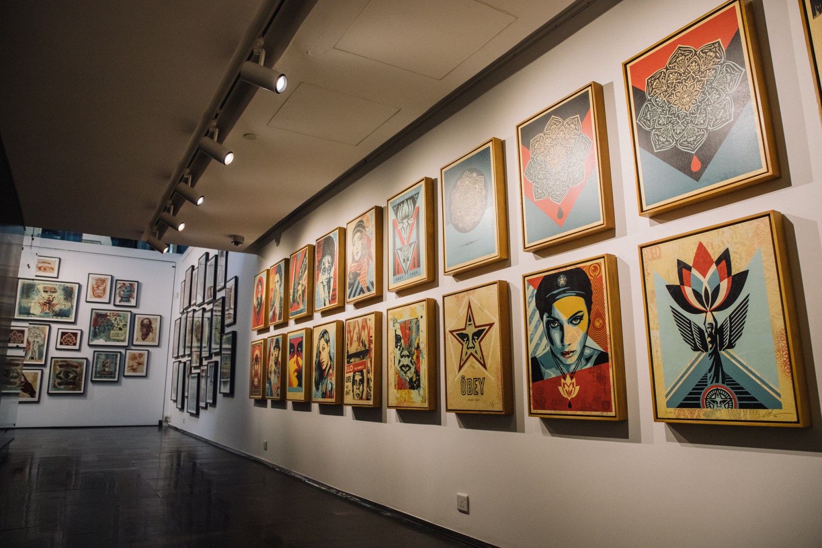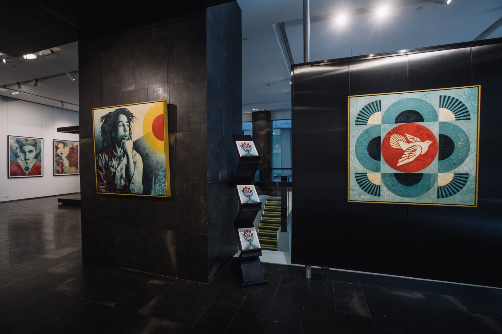 The Opera Gallery exhibition in Dubai features a large number of new works that point toward Fairey’s development, but it also includes classic imagery that has been refreshed and reflects on his history of image-making. Fairey’s rich use of pattern along with motifs influenced by a variety of cultures throughout history, including ornamentation and references to Middle Eastern and Arab symbology, come together harmoniously.