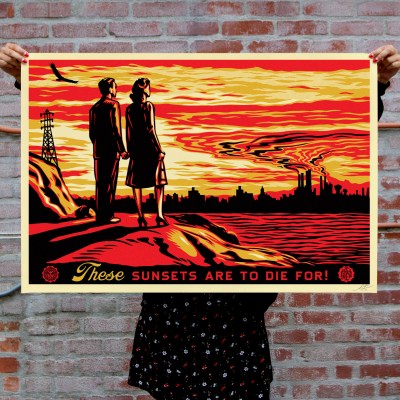 PRINT DETAILS: These Sunsets Are to Die For! 24 x 36 inches. Offset on 80# cream Speckletone paper. Signed by Shepard Fairey. $35. International customers are responsible for import fees due upon delivery (Except UK orders under $160). ALL SALES FINAL.