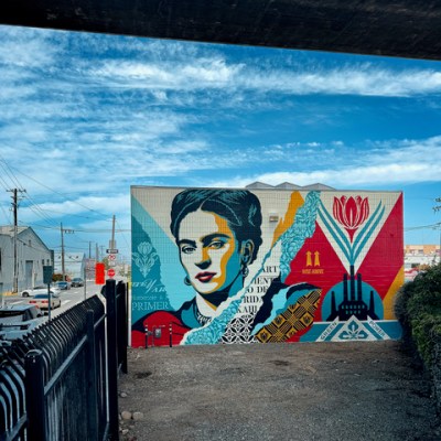 I just returned from San Francisco where I opened an art show called “Fractured” at Harman Projects with Toyroom Gallery. I was very happy to see a lot of San Francisco friends and to do a talk with Carlo McCormick, a long time friend and collaborator who curated the first art show I was ever part of in NYC. Along with the art show, the crew and I painted a mural of Frida Kahlo in the Dogpatch near the gallery. I chose Frida because she was a phenomenal artist, but also because she used flowers and greenery as symbols of health and fertility in her work. Frida was unable to have children because of a bus accident when she was 18 and she was very aware of the fragility and value of health. I use flowers in my work to represent health and to urge environmental responsibility, so I saw a nice pairing between Frida and my Green Power factory. Frida is also an inspiration as a woman who remained outspoken despite sexist dismissals that she was merely “Diego Rivera’s wife who painted as a hobby.” Sexism remains a frustrating problem, but Frida’s stature as an artist shows that her outstanding art and voice have transcended and attitudes have evolved… let’s keep pushing forward! Thank you to my team of Dan Flores and Rob Zagula for help on the mural, and to Harman Projects, Toyroom Gallery, and everyone who helped to make “Fractured” a success!