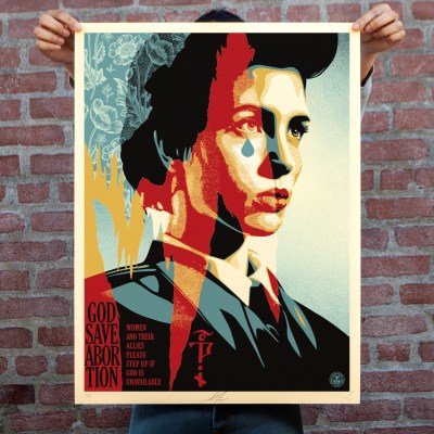 PRINT DETAILS: God Save Abortion. 18 x 24 inches. Screen print on 80# cream Speckletone paper. Original Illustration based on video art directed by Nadya Tolokonnikova of Pussy Riot. Signed by Shepard Fairey and Nadya Tolokonnikova. Numbered edition of 550. Comes with a Digital Certificate of Authenticity provided by Verisart. $90. A portion of the proceeds will be donated to Planned Parenthood. Available on Thursday, June 12th @ 10 AM PDT at Obey Giant Store. Max order: 1 per customer/household. International customers are responsible for import fees due upon delivery (Except UK orders under $160). ALL SALES FINAL.