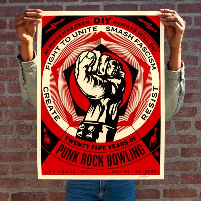 PRINT DETAILS: Punk Rock Bowling (2025). 18 x 24 inches. Screen print on 80# cream Speckletone paper. Signed by Shepard Fairey. Numbered edition of 550. Comes with a Digital Certificate of Authenticity provided by Verisart. $60. Available on Sunday, May 25th @ 10 AM PDT at Obey Giant Store. Max order: 1 per customer/household. International customers are responsible for import fees due upon delivery (Except UK orders under $160). ALL SALES FINAL.