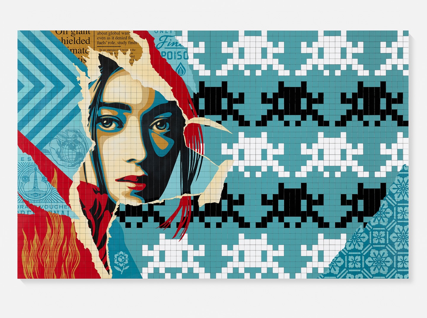 The Obey Invader works offer a new take on some of Fairey and Invader’s most recognisable imagery by presenting them in a new context. Fairey’s Obey Star develops his well-known motif of the Obey Icon face and is a symbol that encourages viewers to find their own interpretations of the world around them. Invader’s pixelated creations reference the icons of early video games, through which the artist questions the invasion of the digital world into our daily lives.